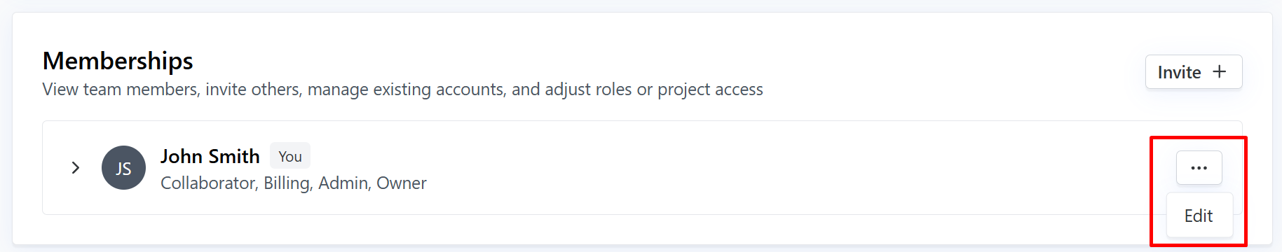 All active team members are listed under the “Membership” box. To change a user’s role within your team, click the three dots next to their name and select “Edit”.