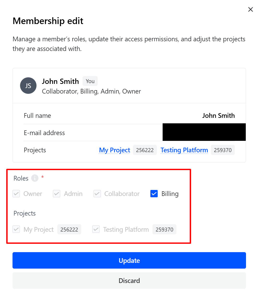 Select, or unselect, the roles you would like to alter, and the projects you would like the team member to be able to work on, and press “Update”.